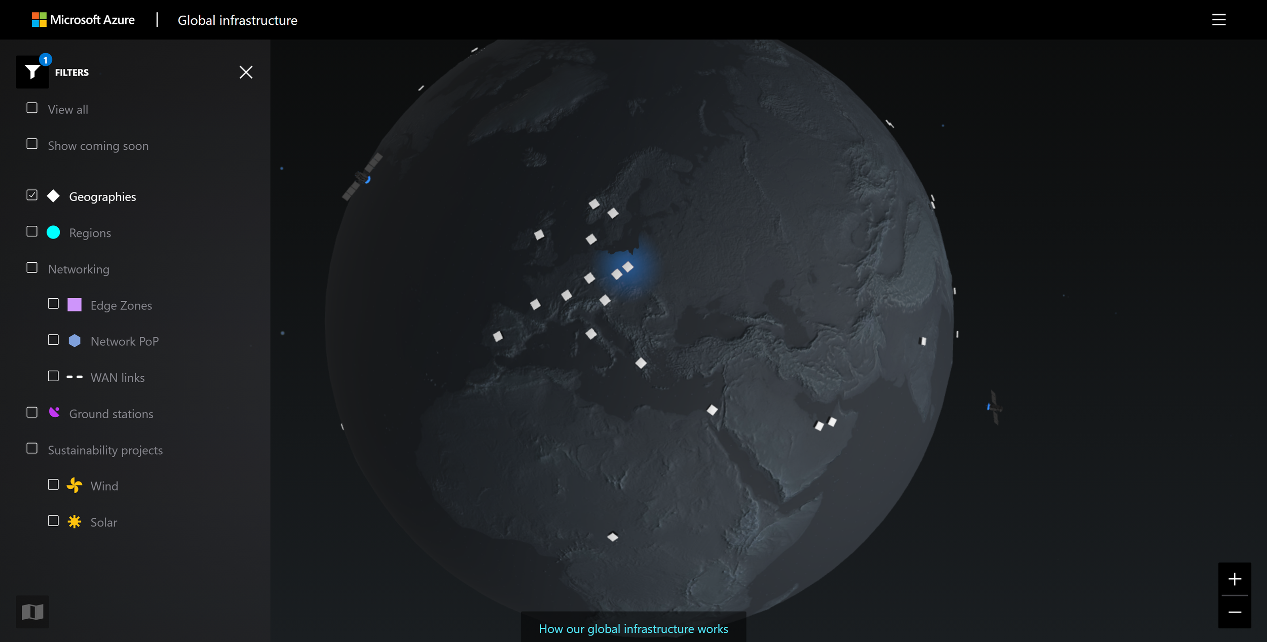 Going from a simple map graphic to a WebGL globe was a big jump for Azure. We included filter systems and different view modes, and later versions of the site introduced tours through datacenters and satellite views.