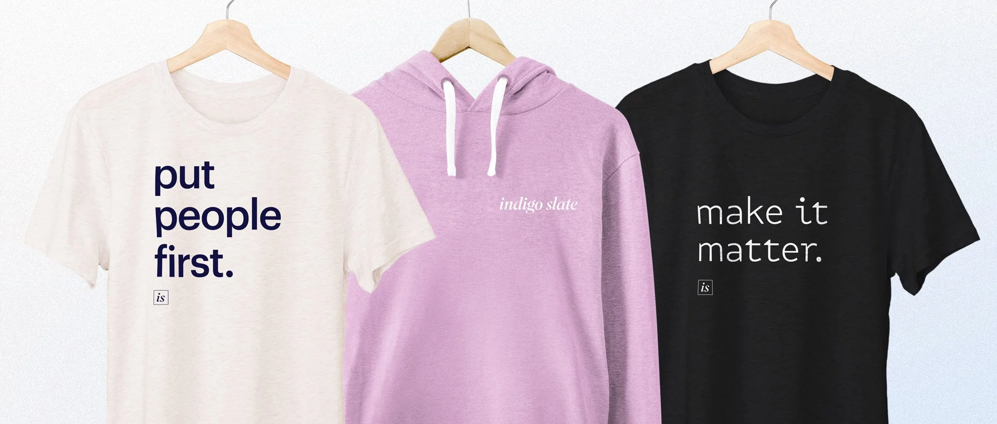With a name like “Indigo Slate” it was inevitable that we needed the perfect shade of bluish purple. As a primarily digital agency, we chose a color that is digital first— a vibrant indigo that thrives on a screen. But to make the palette distinct for a creative agency in the tech world, I added a statement pink. It’s a blush hue that represents excitement and vitality, but it’s also a reminder that people, clients and co-workers alike, should be at the center of the business.